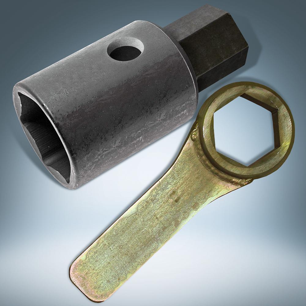 Головки комплектуются соответственно ключом с зевом 55, 65 или 75 мм в зависимости от размера шестигранника